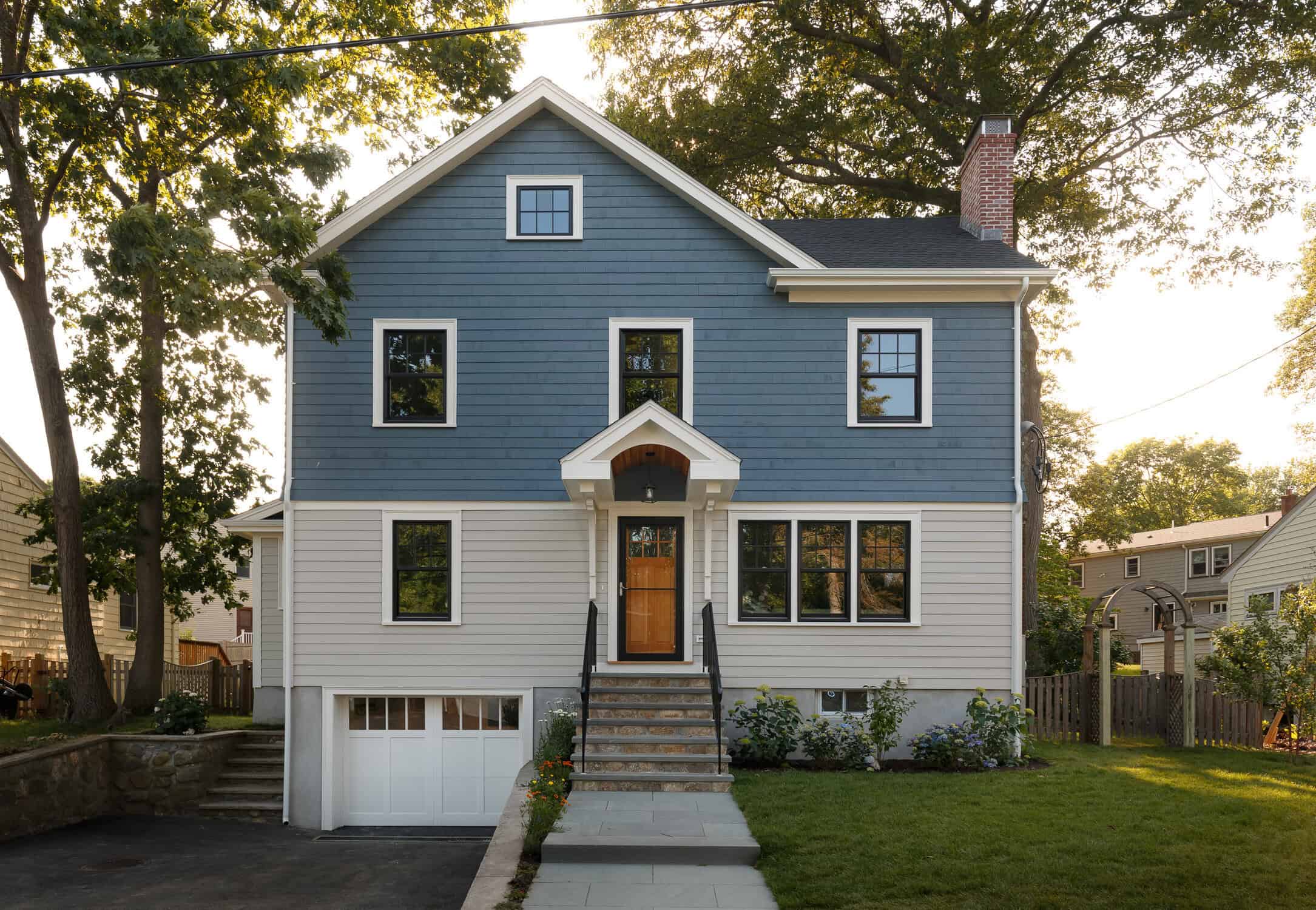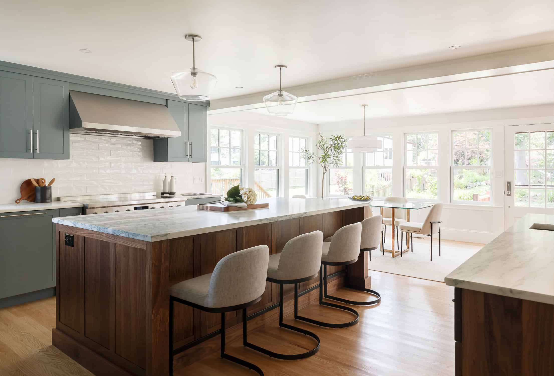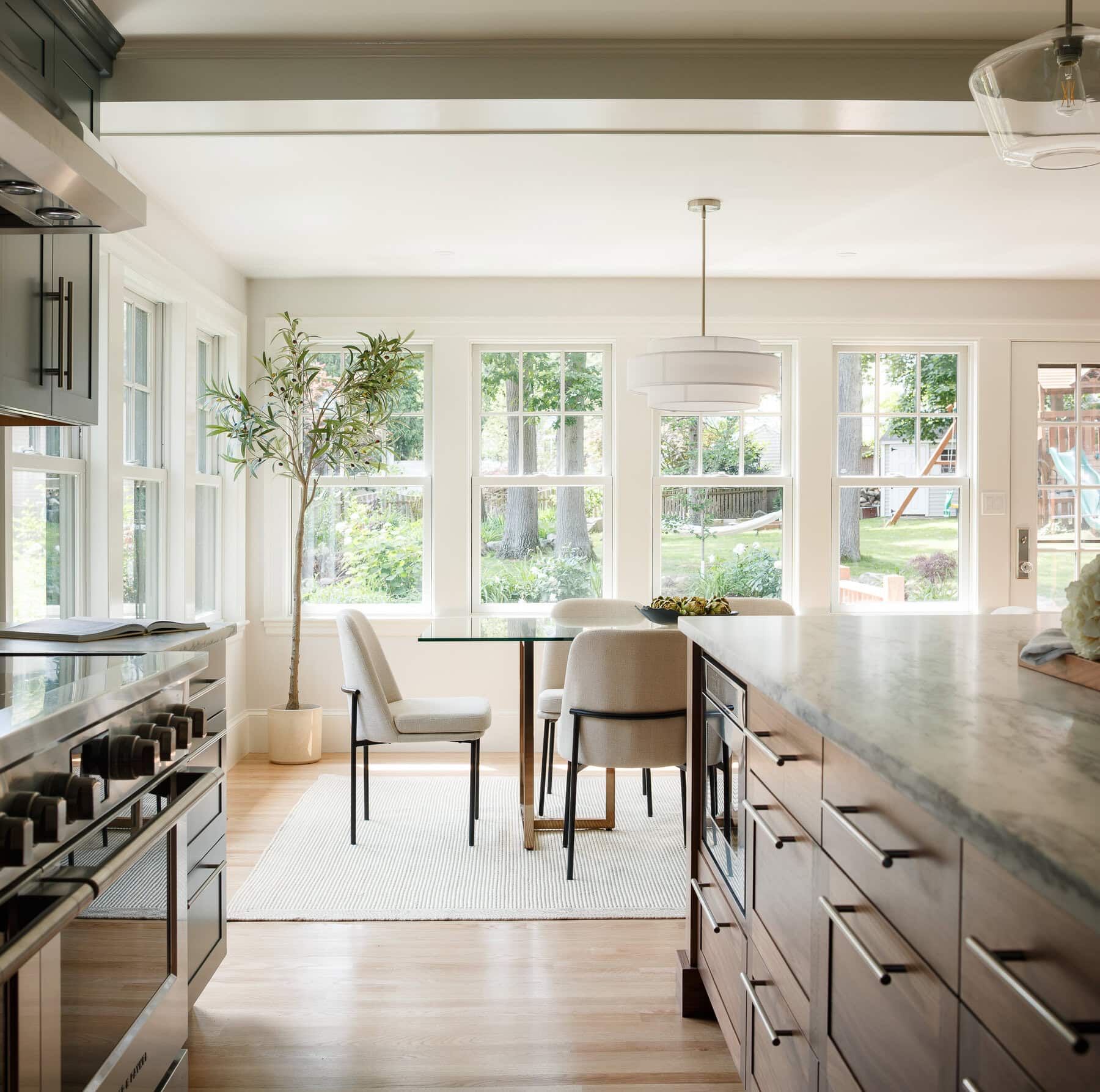 This house started life as a small postwar Cape. We expanded it up and out, creating a full second floor and a bedroom suite on the third floor. The owners are both chefs. The house is centered on a large kitchen, with top tier appliances and acres of cabinets and counter space. The kitchen is open to a dining room and family room space, which together are wrapped with windows facing the back yard.