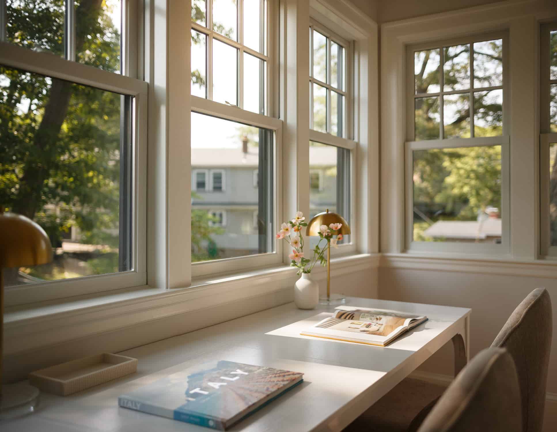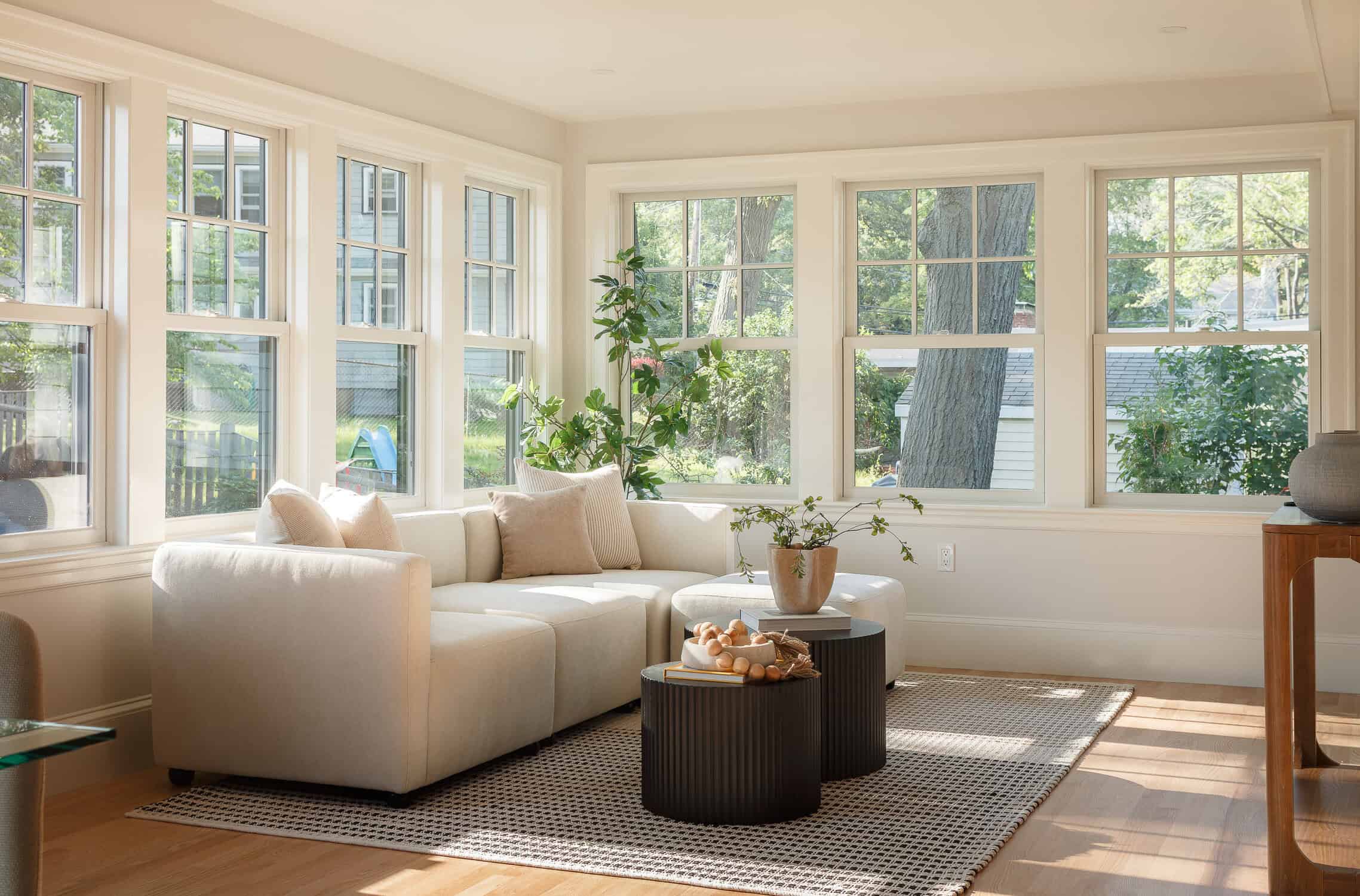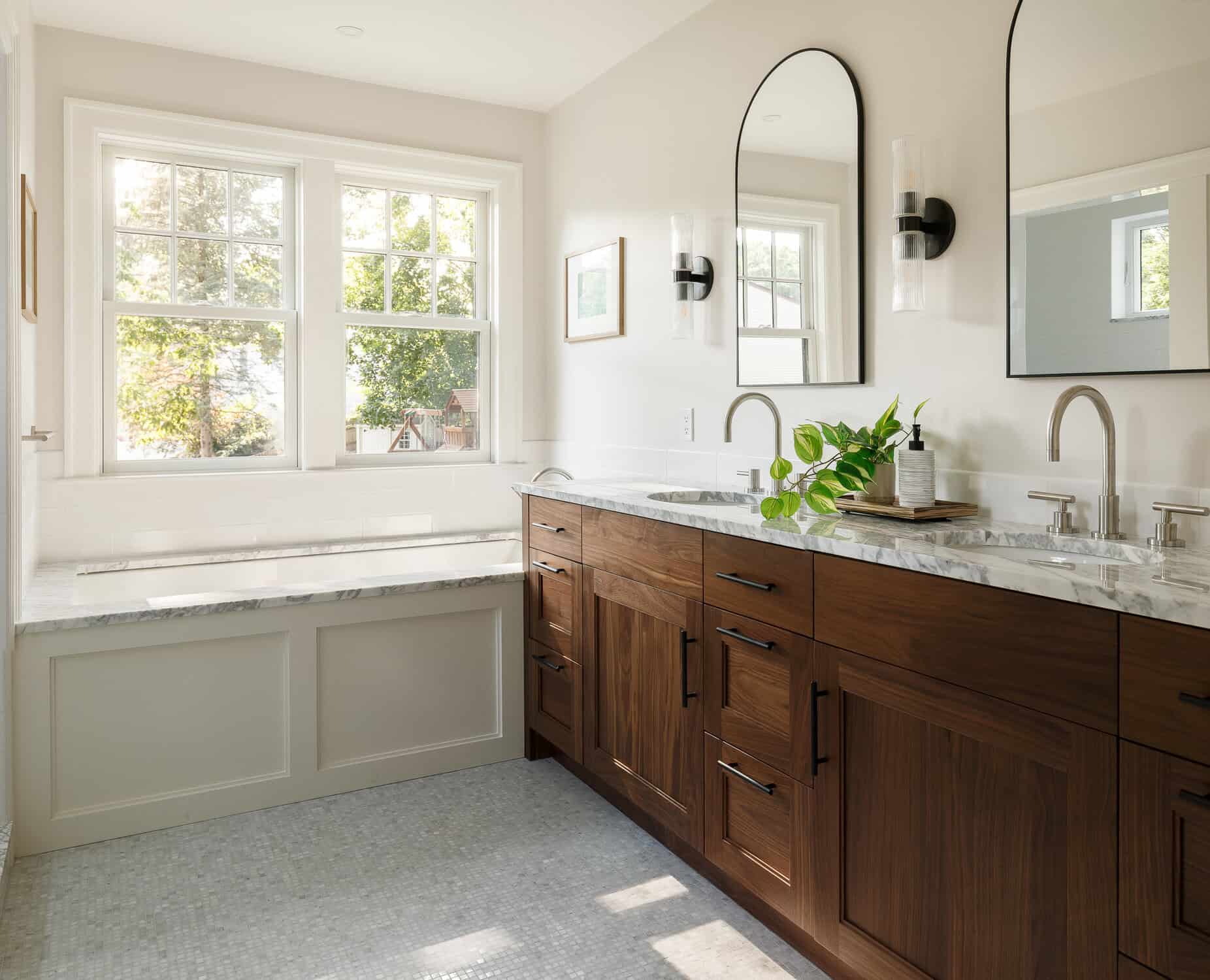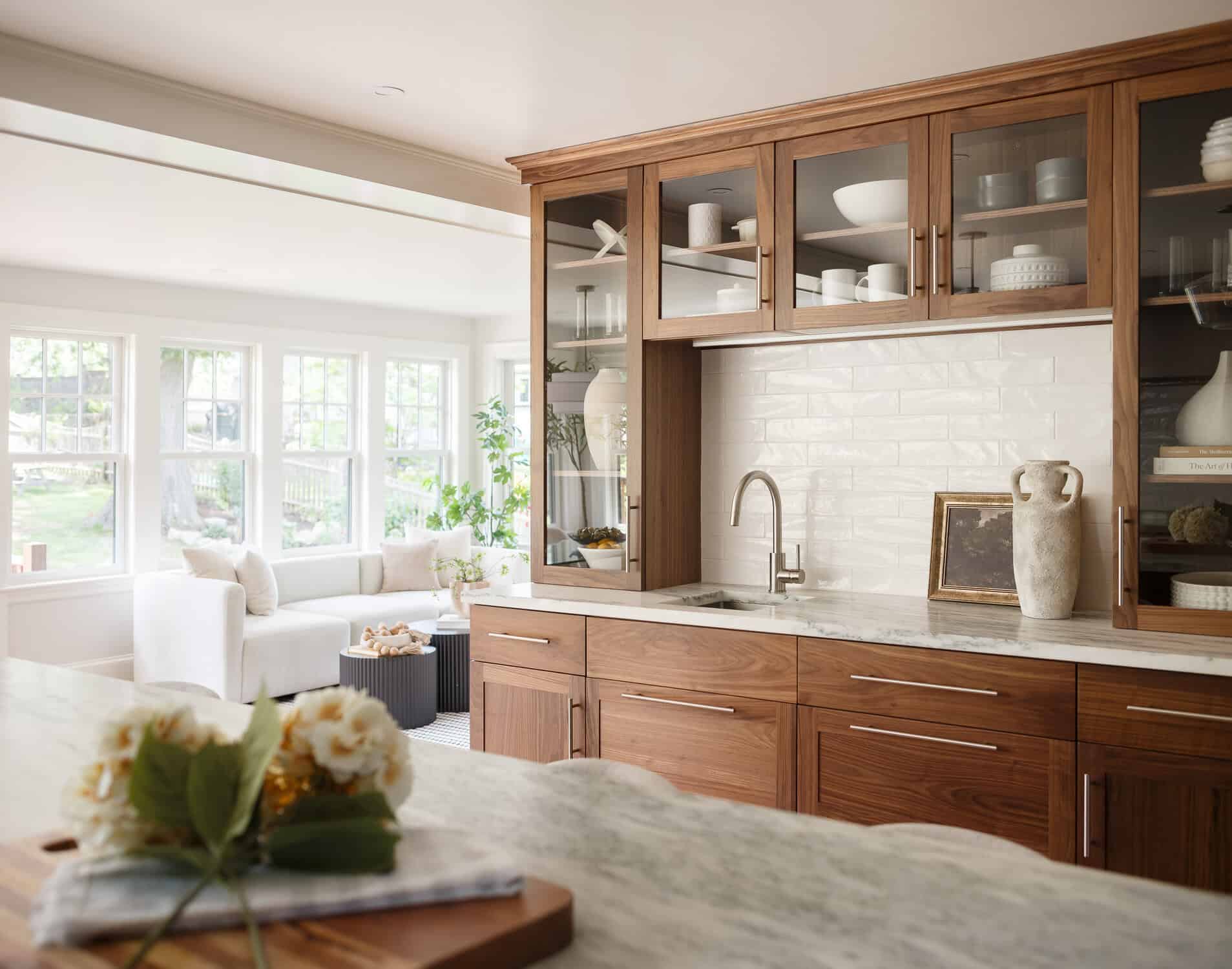 This house started life as a small postwar Cape. We expanded it up and out, creating a full second floor and a bedroom suite on the third floor. The owners are both chefs. The house is centered on a large kitchen, with top tier appliances and acres of cabinets and counter space. The kitchen is open to a dining room and family room space, which together are wrapped with windows facing the back yard.