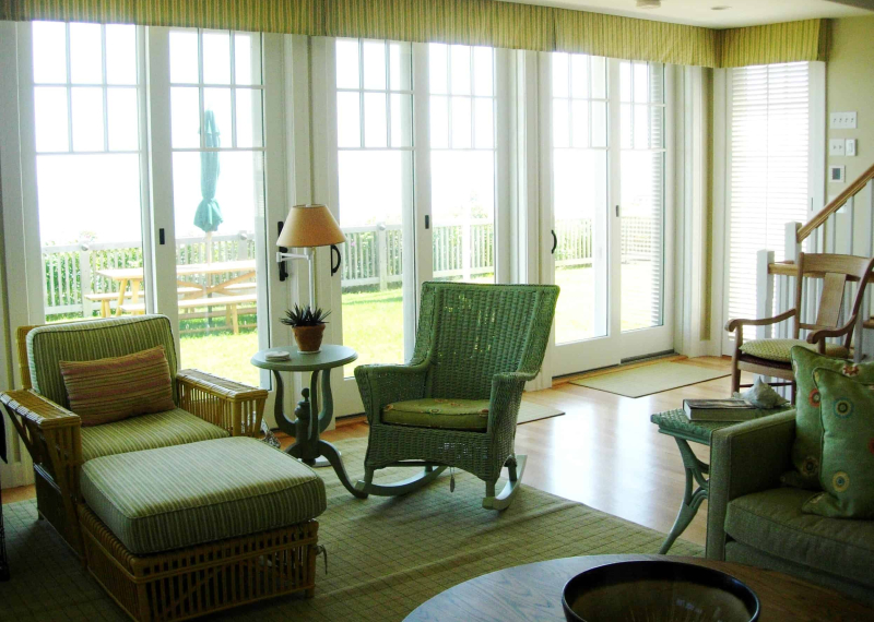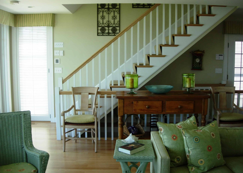The details and materials are traditional, in keeping with the house’s surroundings, but the plan is open and casual to accommodate a family at the beach.
